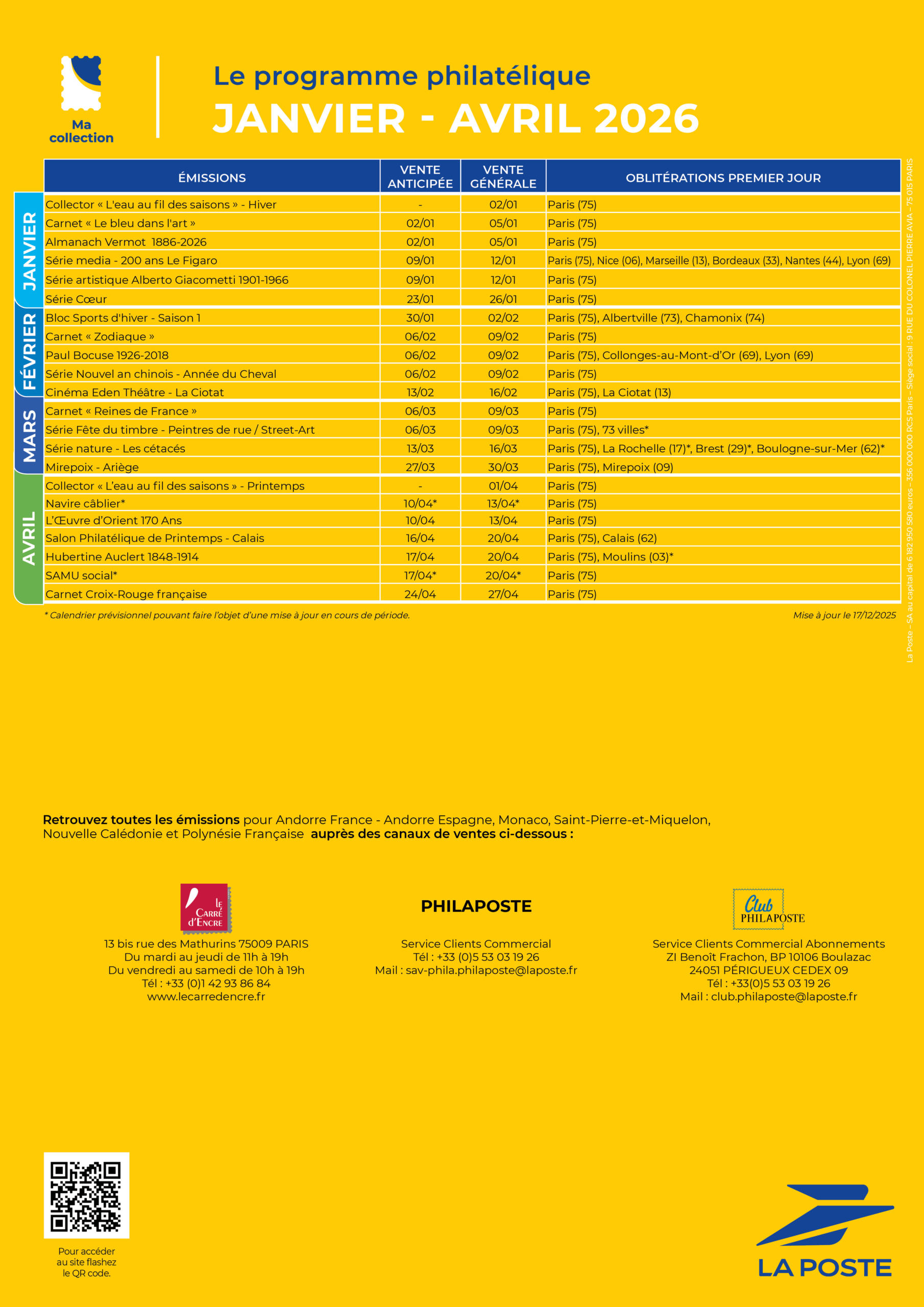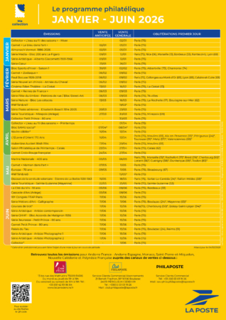 Les émissions philatéliques du mois de janvier à avril 2026 sont annoncées !