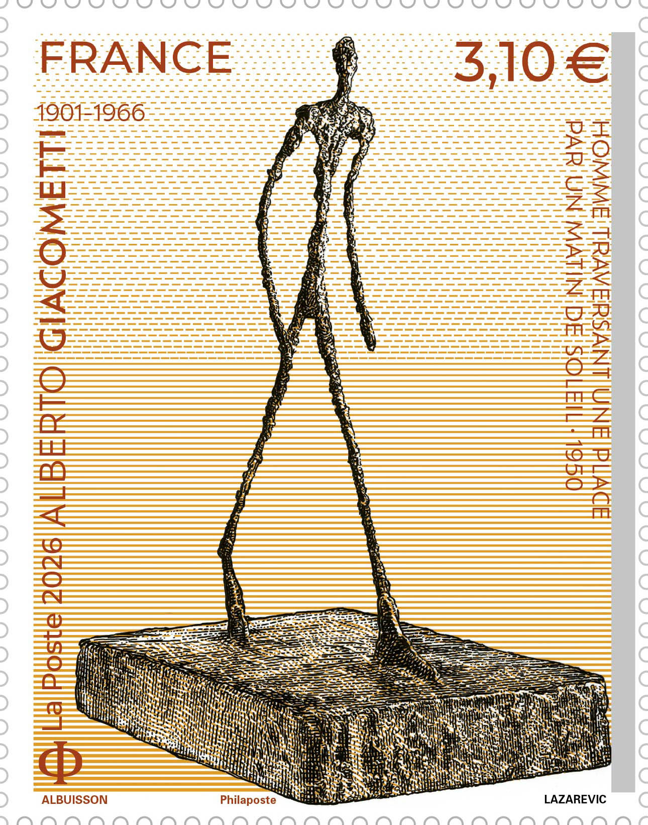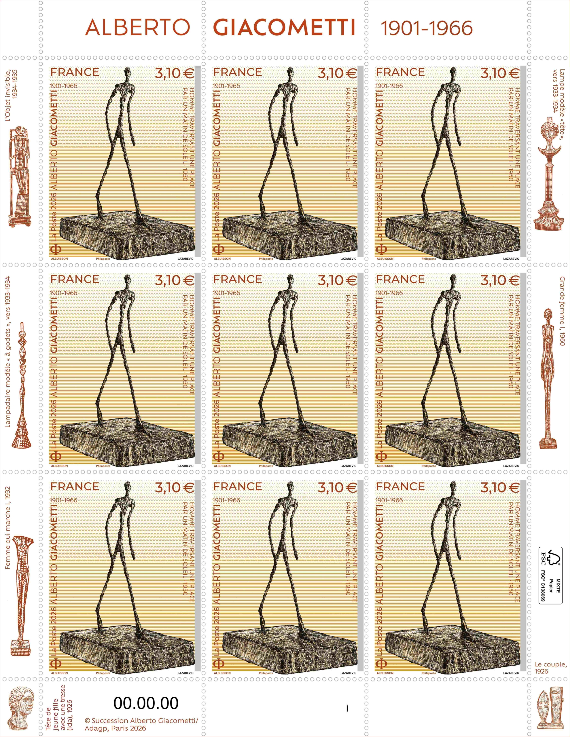 création Pierre Albuisson d'après photo Christie's / Artothek / La Collection, Homme traversant une place par un matin de soleil - 1950 © Succession Alberto Giacometti / Adagp, Paris 2026. Gravure Sarah Lazarevic. Contour de feuille : création Pierre Albuisson. Lampe modèle "tête" vers 1933-1934, Grande femme I, 1960, Le couple, 1926, L'objet invisible, 1934-1935, Lampadaire modèle "à godets", vers 1933-1934, Femme qui marche I, 1932, Tête de jeune fille avec une tresse (Ida), 1926, d'après © Succession Alberto Giacometti / Adagp, Paris 2026