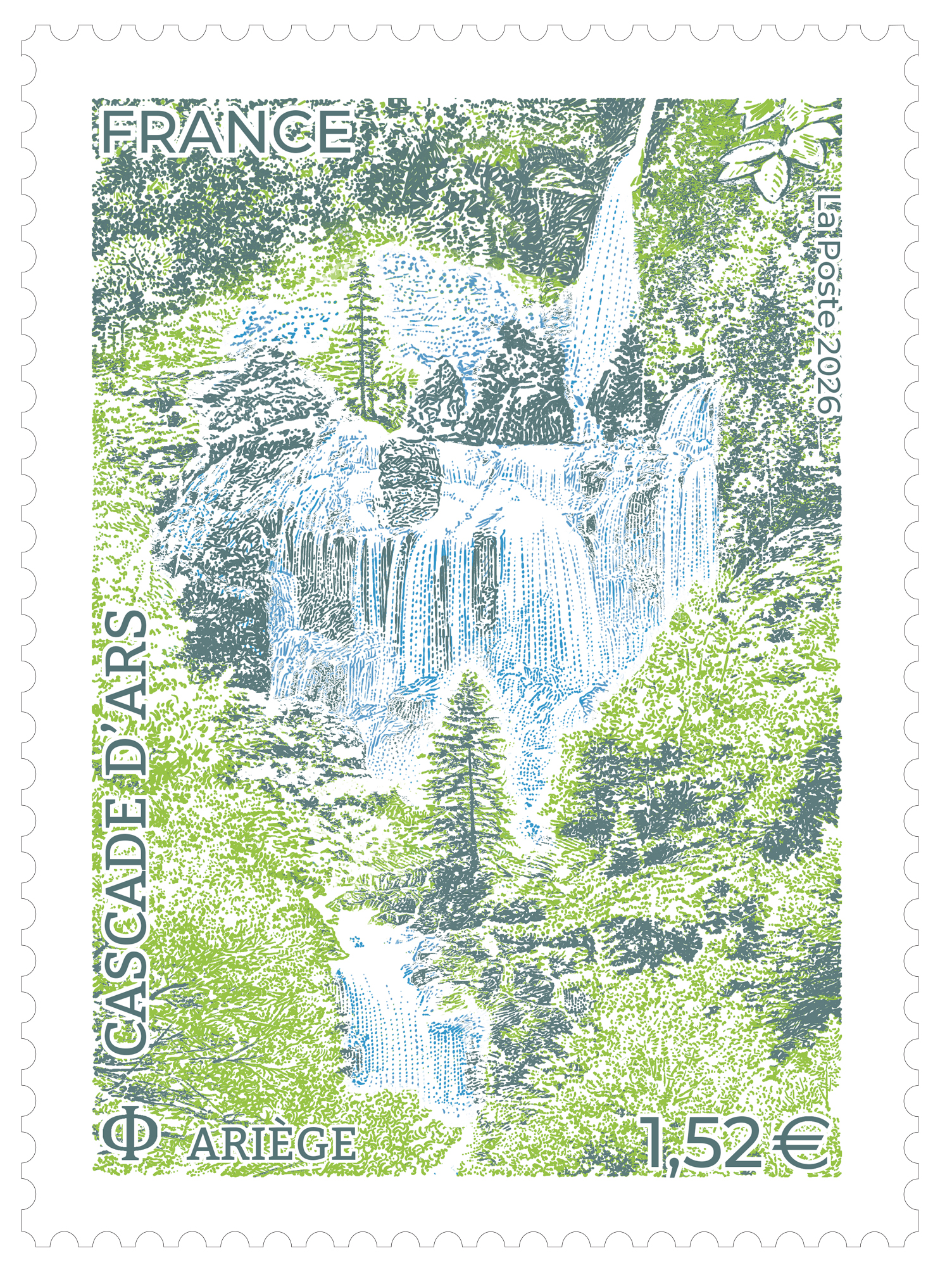 Le 8 juin 2026, La Poste émet un timbre sur la cascade d’Ars située dans le Parc naturel régional des Pyrénées Ariégeoises dans le Couserans.