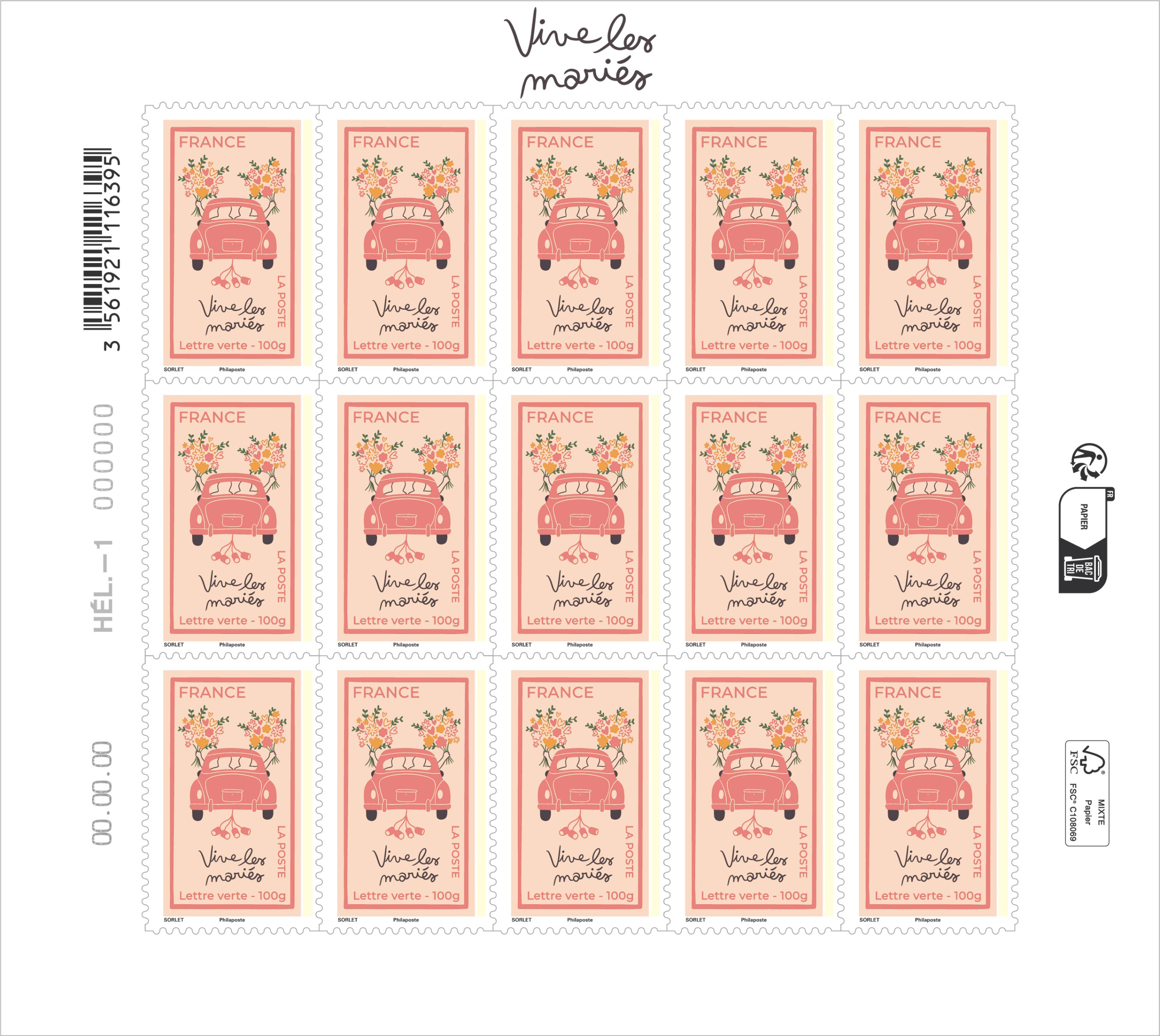 - Valeur faciale 3,10 € Lettre verte 100g pour Mariage, soit 46,50 € la feuille.